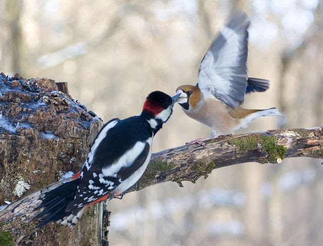 Yes, the animal world can be harsh and cruel as well as ours is and it is much about the survival of the fittest and the most insolent. So here’s a story where a woodpecker and a grosbeak came across... Only one could stay with delicious food and the other one should kiss this food goodbye… Or maybe it was just a kiss